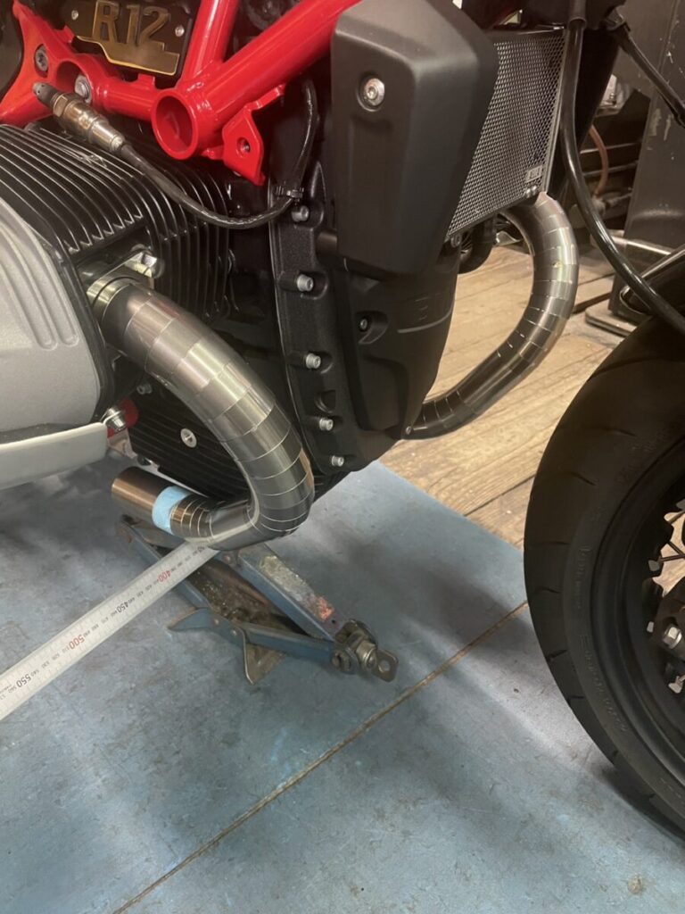 ↓ボクサーツインの場合、左右のシリンダーに前後方向のオフセットがあるため、管長が左右で同じであっても、右側のエキパイはわずかに前方に突出する形となります(画像では少々分かりづらいかもしれませんが…)